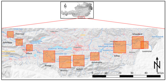 Austrian part of the river Drava with sites of the HPP, red squares indicate the runoff-river-stations with hydropeaking according to [26], © Land Kärnten—KAGIS, BEV.