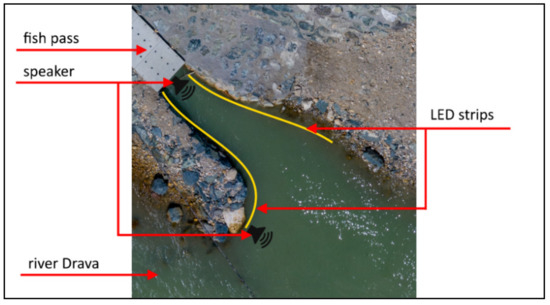 At one site, at the HPP Edling, light and acoustic were set manually as key stimuli during the spring and autumn monitoring in 2019 from 19 April 2019 to 18 June 2019 and from 17 September 2019 to 4 November 2019. This was to investigate the phototactic and phonotactic behaviour of the fish to determine whether these manually placed stimuli have an influence on the ascent rates and the findability of the fish pass entrance. The light stimulus was set by three LED strips with 630 lm/m and a total length of 15 m, which were positioned downstream from the first pool of the fish pass on both sides of the bank (Figure 3). The LED strips with a beam angle of about 110° were fixed about one meter above the ground. The resulting illuminance was about 50–100 lux, depending on the turbidity in the Drava. The acoustic stimulus was set by two under water speakers, which were positioned in the entrance area of the fish pass. The signal, played through an amplifier in a loop, was recorded in the preliminary study at a spawning location, known to be passed by many fish. The recording was made, using a calibrated measurement chain consisting of a Teledyne Reson TC4034 hydrophone, the corresponding Teledyne Reson EC6067 preamplifier and a Norsonic NOR140 Class I sound level meter. The volume of the signal was chosen to correspond to the sound pressure level at the recording location [30].