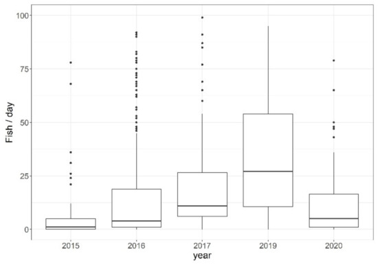 Since the study spanned 5 years of observations, the variable “year” addresses the fact that the number of migrating fish varies from year to year. This variation is based on influences not considered here, such as extreme floods and turbidity, among others, that have a strong impact on migration and are capable of destroying downstream habitats, as well as entire populations of juvenile fish and larvae [28,29]. The unobserved differences between the three locations of the fish passes were represented in the statistical models by the categorial variable “site”.