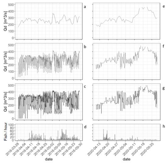 The discharge in the river Drava during the study period (mean = 274 m3/s, SD = 140.43 m3/s), as well as the attraction flow (mean = 4.66%, SD = 24.98%), demonstrate considerable variability. It is based on the fact that the mean discharge of the Drava in the study area is about 274 m3/s, while the minimum discharge with closed turbines is at about 0.1 m3/s. The hydropeaking at the HPP of the river Drava shows a pronounced diurnal variation, which is caused by the mode of operation. This variation can be easily observed from the 1-h data up to the 6-h data, but is no longer discernible in the 24-h data due to aggregation. Since the three HPPs are operated nearly simultaneously, and the requested power is determined by the national load dispatch centre, the difference in hydropeaking was independent of the power plant location, but was highly noticeable when comparing the different years (Figure 5). Another striking feature of this Figure, which compares a period of strong hydropeaking (a–d) with a period of a relatively weak one (e–h), is that the ascent rates seem to be unrelated to the mode of operation of the HPP.