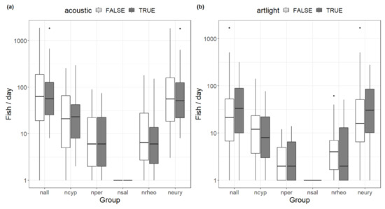Boxplots of artificial stimuli acoustic (a) and light (b), at the fish pass of HPP Edling sorted by investigated groups; boxes indicate the inter-quartile range (IQR), black horizontal line within the boxes show the medians, whiskers show values within 1.5 × IQR and dots indicate outliers.