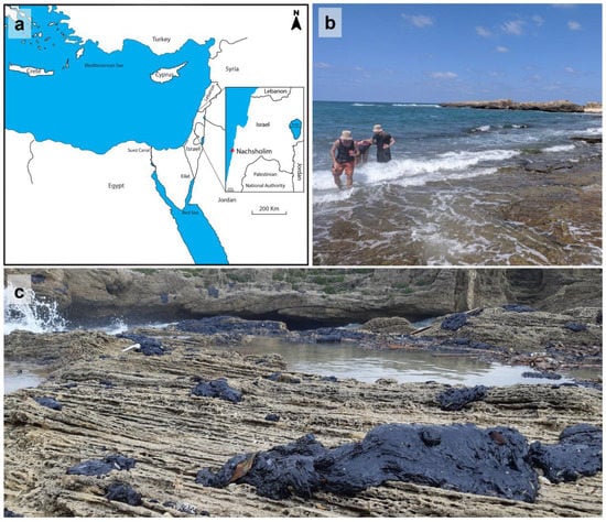 (a) Location map of the studied site, the Natural Reserve Nachsholim, at the northern Mediterranean coast of Israel. (b) View of the hard bottom shallow habitat of Nachsholim during the August 2021 sampling campaign. (c) Nachsholim Site abrasion platforms covered with tar after the February 2021 spill event.