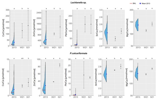 Years: Zn/Ca, Cu/Ca and Pb/Ca were significantly higher in 2021 compared with 2013–2014 in both species (Tables S4.3 and S4.6), except the Cu/Ca and Zn/Ca winter records of P. calcariformata. Among these, the most substantial increases were in Pb/Ca in both species, and in Cu/Ca of Lachlanella. Sr/Ca of Lachlanella were similar between 2013–2014 and 2021, and higher in P. calcariformata in 2021, compared with the 2013–2014 average values. Yet, this natural increase is negligible compared with the anthropogenic enrichments in Pb/Ca (8% vs. 2600%, respectively). Mg/Ca Lachlanella were lower in winter 2021 compared to the lower values of 2013, indicating colder winter temperatures in 2021. These differences were not recorded in P. calcariformata since this species is known to reduce shell growth under 24 °C []. On the other hand, Mg/Ca of P. calcariformata were significantly higher in 2021 than in 2013, indicating warmer summer temperatures in 2021.