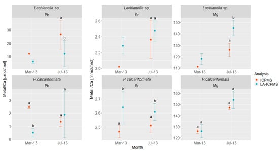 Comparison between specimens collected during March 2013 and July 2013 measured by both ICPMS and LA-ICPMS. The blank-to-signal ratios of Cu and Zn ICPMS analyses were too high and therefore could not be used in this comparison. Letters show statistically significant differences between the analytical techniques.