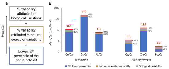 (a) Schematic illustration of the methodological approach for calculating the BAL values. (b) Calculated BAL values (marked in red) of each HM for the two species (logarithmic scale). These levels define the minima background concentrations for each HM within a certain area, expressed as metal/Ca. The BAL was defined as the 5th lower percentile metal/Ca calculated from the entire LA-ICPMS dataset (blue) plus the percent of metal/Ca attributed to natural seawater variability (orange) plus the percent of metal/Ca attributed to natural biological variations calculated by culturing experiments (gray) (see text for details).