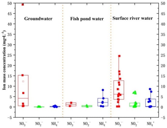Among the six fish pond samples, a higher concentration of NH4+ was detected. The maximum mass concentration of NH4+ in fish pond water was 8.2 mg·L−1, which was 16.3 times the limit. The maximum concentrations of NO3−, NO2−, and NH4+ were 24.5, 7.3, and 8.6 mg·L−1 in surface river water, respectively, which were 1.2, 7.3, and 17.3 times the limit.