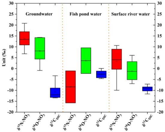 It can be concluded from Figure 4 that, in three different types of water bodies, the order of δ 15N-NO3 was groundwater > surface river water > fish pond water; the order of δ 18O-NO3 was groundwater > fish pond water > surface river water; and the order of δ13CDIC was fish pond water > surface river water > groundwater.