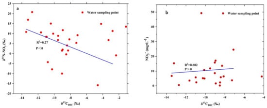 The relationship between δ 13CDIC and δ 15N-NO3 (a) and NO3− (b) in the water body study area.