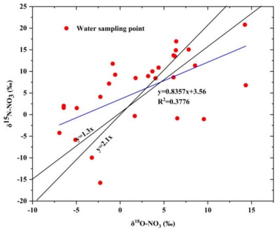 The process of denitrification causes significant isotope fractionation, which leads to the enrichment of heavy δ 15N-NO3 and δ 18O-NO3 in groundwater residues. The ratio of δ 15N-NO3 to δ 18O-NO3 is usually between 1.3 and 2.1 [,,]. As can be seen from Figure 9, only two spots in all samples were within the range of denitrification and the fitting formula of δ 15N-NO3 and δ 18O-NO3 was y = 0.857x + 3.26. In addition, it is generally believed that denitrification will occur when the concentration of DO is less than 2 mg·L−1 [], while the range of DO of each sampling in the study area was 2.24~14.80 mg·L−1, and the average value was greater than 6 mg·L−1. It was an aerobic environment, which also showed that significant denitrification does not easily occur. It showed that nitrification is the dominant process of the whole study area.