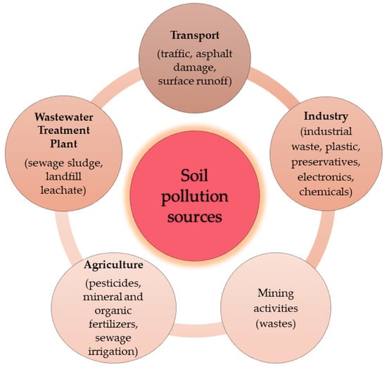 Soil is an integral part of natural environment that includes the interactions between organisms, air, water, nutrients and numerous other parts of the ecosystem. Due to its complex matrix, it is a storehouse of both the nutrients necessary for plants and microorganisms and toxic substances that interfere with biochemical processes [4]. Contaminants introduced into soils in the form of different types of xenobiotics, for instance, persistent organic pollutants (POPs) or heavy metals, can directly or indirectly affect all living organisms present in soil and water (Figure 1). Moreover, they also have a significant impact on human health [5,6]. According to the WHO, in the last 10 years, as many pollutants have entered the environment as in the previous 70 years, and their amount tends to be increasing [2].