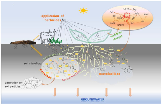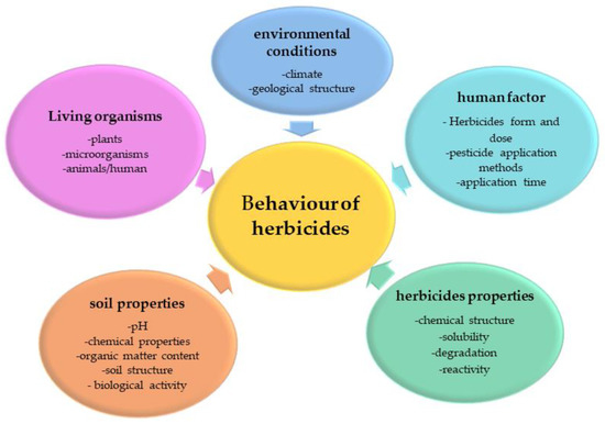 Herbicides in soil can penetrate other links in the food chain, including plants, animals and humans (Figure 2 and Figure 3). In the environment, herbicides are able to affect living organisms through interactions between the contaminant and the organism, which can lead to an inhibition of growth and physiological functions, changes on the cellular level, mainly in DNA and proteins, and eventually death [32]. The changes that occur after contact with the herbicide are related to the uptake of the contaminant. According to Wołejko et al. [4], the metabolism and degradation of herbicides by microorganisms depend on their ability to use contaminants as a source of carbon and bacterial adaptation to inhabit a contaminated environment. In contrast, the behavior of herbicides in soil may depend on various factors, such as climatic factors, soil physico-chemical properties and characteristics of herbicides influencing persistence in the environment (solubility, degradation time, reactivity, form and dose application) (Figure 3). Living organisms, both animals and human, may not be able to transform the compound or may produce toxic end-products as a result of metabolizing this substance. Obviously, the process depends on the organism species and the bioavailability of the compound [33].