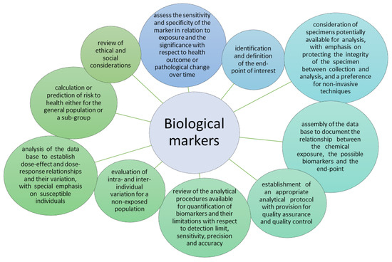 Since the amount of pesticides, especially herbicides, present in environmental samples does not fully inform about the effects that occur in living organisms, additional biomarkers should be used. They are defined as sub-individual, biochemical, molecular and physiological reactions that provide a valuable tool for understanding the exposure magnitude from all pathways and sources. Biomarkers are primarily implemented in the study of health risks associated with occupational or environmental exposure of the human population to harmful agents or carcinogens [61]. In this context, the biomonitoring of humans, which is carefully developed, uses biomarkers that include either the parent compounds or their metabolites, which are identified in a variety of human specimens, such as urine, hair, blood or/and deciduous teeth [62]. Obviously, when selecting a suitable biomarker, some important aspects need to be taken into account, and on the basis of their analysis, the choice should be made. Figure 4 shows a schematic overview of biomarker selection [61,63].