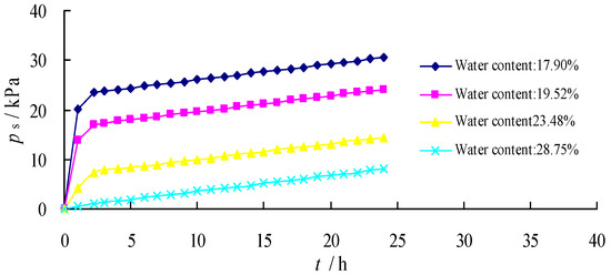 This study simulated the instability of filling an embankment with an expansive soil in the G316 National Highway. The G316 National Highway in Shaanxi Province was 603 km long. The length of expansive soil along this highway was approximately 200 km, whereas that in Hanyin County of Ankang was 64 km. Most of soil in the Hanjiang River basin and Ankang basin was basically typical expansive soil with a slope. The expansive soil sample for the test was collected from Hanyin County. Hanyin County belongs to the northern subtropical monsoon humid climate zone. The annual average temperature is 15.1 °C, the frost-free period is 258 days, precipitation is 782 mm, and the climate is mild and humid. For the equivalent expansive force test experiments under different initial water contents by the developed testing device, the change curves of the expansive force with time from a soaking state to a strictly saturated state are illustrated in Figure 2.
