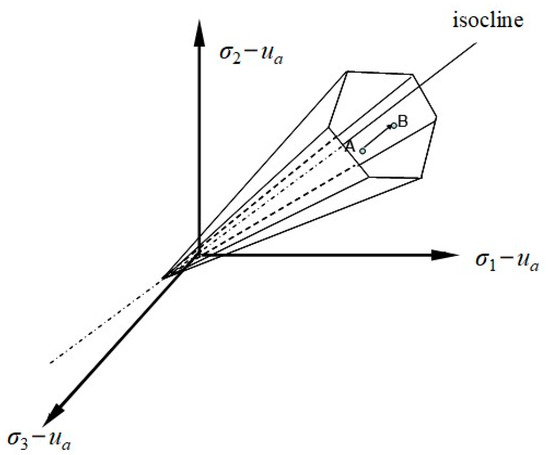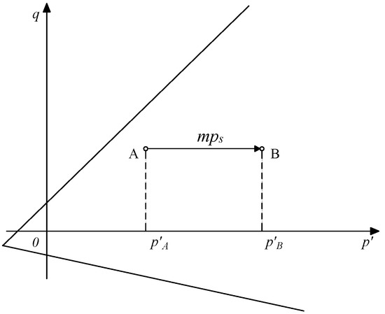 According to Formula (3), it could be found that the strength parameters of c′ and φ′ were not changed, and the Mohr–Coulomb criterion was employed as the strength failure surface in effective stress space. Because the matric suction was the effective stress, the equivalent expansive force that was the equivalent effect of the matric suction also had its significant contribution to the effective stress. In strength reduction FEM calculation, the macro effect of the equivalent expansive force could be obtained from the product of m and ps in every element, and then a new effective stress state could be formed when the macro effect mps of the equivalent expansive force was added to the gravitational effective stress in every element, which included the effects of the equivalent expansive force, as shown in Figure 3 within the three-dimensional effective stress space and Figure 4 within the meridian plane. Seen from that in the effective stress space, the stress state of the point A represented the initial or gravitational stress state in a saturated state, and mps represented the contribution of the equivalent expansive force to the increment of the effective stress. The stress state of the point B was a new effective stress state that integrated the gravitational effective stress with the mps in the unsaturated soil. The algorithm principle of the computational method on the stability of unsaturated expansive soil may indirectly reflect the contribution of matric suction using the corresponding equivalent expansive force, in which the matric suction is equivalently substituted by the equivalent expansive force.