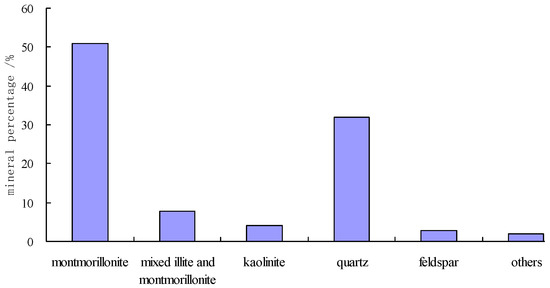 The expansive soil sample for the test was collected from Hanyin County of Shaanxi Province. The soil was brown, and its colour was deeper when it was under humid conditions and lighter when it was dry. The mineral contents of the expansive soil were identified via X-ray diffraction. The contents were mainly montmorillonite, quartz, and illite, including 51% montmorillonite and 31% quartz (Figure 5). The test employed a liquid–plastic limit combined device to measure the liquid limit (wL = 38.2), plastic limit (wP = 14.7), and shrinkage limit (wS = 12.3), respectively, and to calculate the plasticity index (IP = 23.5). The expansive soil had a high liquid limit and plasticity index. Based on the laboratory routine test measurement, the natural water content (w) of the expansive soil was 17.90%, soil natural density (ρ) was 1.94 g/cm3, and dry density (ρd) was 1.65 g/cm3.
