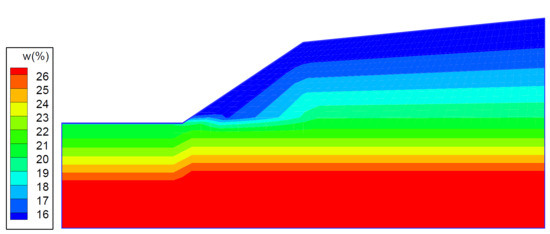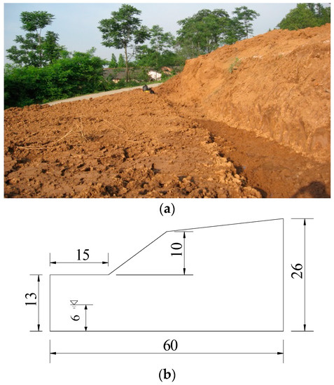 The G316 National Highway in Shaanxi Province was 603 km long. The length of expansive soil along this highway was approximately 200 km, whereas that in Ankang Hanyin was 64 km. Most of soil in the Hanjiang River basin and Ankang basin was basically typical expansive soil with a slope. The following landslide example simulated the instability of filling an embankment with an expansive soil along the G316 National Highway. The slope consisted of two parts: the lower part of the slope was 10.0 m high and had a gradient of 1.0:1.5, whereas the upper part was 3.0 m high and had a gradient of 1:10 (Figure 8). The foundation depth was 13 m, and the underground water table was located at a depth of 7.0 m.