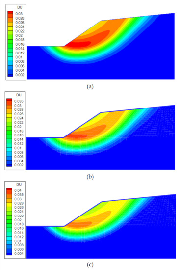 For the non-uniform distribution of matric suction or the equivalent expansive force, Figure 13a shows the contours of the displacement increment for Case 1-1. The safety factor (Fs = 1.64) was calculated by the strength reduction FEM based on Bishop’s unsaturated strength formula. The displacement increment contours for Case 1-2 are shown in Figure 13b. The safety factor (Fs = 1.63) was calculated by the strength reduction FEM based on Fredlund’s unsaturated strength formula. The contours of the displacement increment for Case 1-3 are illustrated in Figure 13c. The safety factor (Fs = 1.60) was calculated by the strength reduction FEM based on the equivalent expansive force.