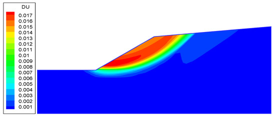 Since the displacement in the strength reduction FEM calculation was only of relative significance, the displacement increment field was obtained by the difference between the two displacement fields and the adjacent value, F. It was assumed that the position of the potential sliding surface was determined according to the position of the maximum gradient of the displacement increment contour. In this program, it was one of the prominent advantages of this method that the position of a potential sliding surface could be determined by the contour density of the displacement increment.