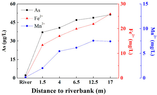 As was significantly positively correlated with Fe2+ and Mn2+ and negatively correlated with NO3− and SO42− (Table 2). NO3− and SO42− also had a negative correlation with Fe2+ and Mn2+, indicating that with the infiltration of river water, Fe3+, Mn4+, NO3− and SO42− were reduced in the process of increasing the arsenic concentration. There was a significant correlation between the components, indicating that there was a close relationship between iron, manganese, nitrogen and sulfur and the release of arsenic.