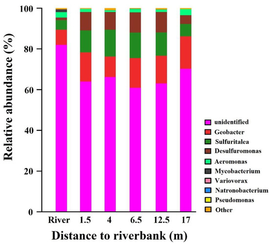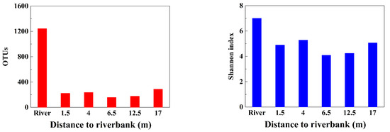 The Shannon index of the river water was high, indicating that the river water had a high species diversity and rich species. Along the groundwater flow direction, the microbial diversity in groundwater generally decreased gradually, while the corresponding arsenic content in groundwater was high, reflecting that higher arsenic content had a strong inhibitory effect on microorganisms in groundwater, resulting in fewer species [42,43,44].