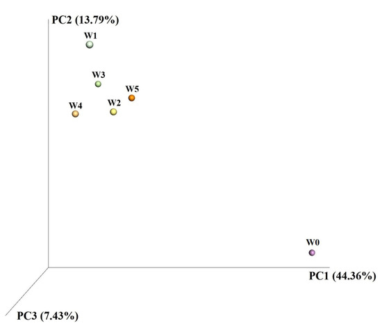 W1, which was spatially closer to the river water, had an obvious deviation from the river water (W0) in the PCoA diagram. With the increasing distance from the riverbank, the deviation between groundwater and river water decreased, indicating that W1 and river water species were less similar than other groundwater, and there were certain differences in the communities. There was a high physical and chemical gradient between W1 and the river water; the microbial activity in the groundwater was high, and the biogeochemical effect was relatively strong. With the further infiltration of river water, the species abundance decreased, and the gradient of environmental conditions decreased relatively.