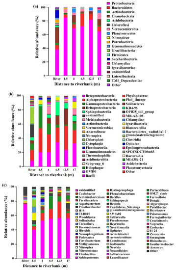 Microbial community composition: (a) phylum-level; (b) class-level; (c) genus-level (Other: the summation of the bacteria, of which the relative abundance was considerably below 2%).