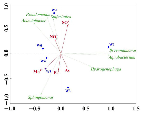 Environmental factors affect the composition of the microbial community in groundwater. A Redundancy Analysis (RDA) was used to analyze the microbial community and environmental factors. The length of the arrows of environmental factors indicates the degree of its impact on the microbial community. As, Fe2+, Mn2+, NO3− and SO42− affect the microbial community (Figure 7). The angles between the arrows of environmental factors represent positive and negative correlations. As was positively correlated with Fe2+ and Mn2+ environmental factors and negatively correlated with NO3− and SO42−, which was consistent with the results of the Spearman correlation analysis. As, Fe2+ and Mn2+ pointed to W3, W4 and W5, indicating that they affected the microbial community structure of the groundwater sample in these three reducing-environment areas, corresponding to the high concentrations of arsenic, iron and manganese in these groundwater samples. Sphingomonas and Hydrogenophaga, which have the ability to metabolize arsenic and iron, accounted for a high proportion. Sulfuritalea is not only an arsenic dissimilatory reducing bacteria, but it is also a sulfur oxidizing bacteria and denitrifying bacteria; Pseudomonas is not only an arsenic-resistant bacteria, but it also can participate in denitrification; Acinetobacter not only has the ability of arsenic metabolism, but it also shows the ability for iron reduction and sulfur metabolism. These three bacteria had a good correlation with NO3− and SO42−.
