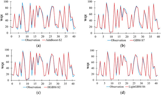 Table 4 exhibits the model performance of the boosting-based algorithms during the testing process. Results showed that AdaBoost-S2 (R2 = 0.973 and RMSE = 0.175) had the highest performance in predicting WQI among the AdaBoost models, GBM-S7 (R2 = 0.989 and RMSE = 0.108) had the highest performance among the GBM models, HGBM-S2 (R2 = 0.967 and RMSE = 0.183) had the highest performance among the GBM models, LightGBM-S6 (R2 = 0.986 and RMSE = 0.119) had the highest performance among the LightGBM models, and XGBoost-S9 (R2 = 0.989 and RMSE = 0.107) had the highest performance among the XGBoost models under the S1–S10 scenarios. Additionally, the comparison plots of the measured WQI values with the WQI values predicted by AdaBoost-S2, GBM-S7, HGBM-S2, LightGBM-S6, and XGBoost-S9 in the testing period are shown in Figure 2. Generally, these models replicated very well the measured WQI during the testing period. However, there are small discrepancies between the measured and predicted WQI high or low values (especially those of AdaBoost-S2 and HGBM-S2). On the whole, the comparison between the boosting-based models under the S1–S10 scenarios demonstrates the XGBoost-S9 model as the best performance model.