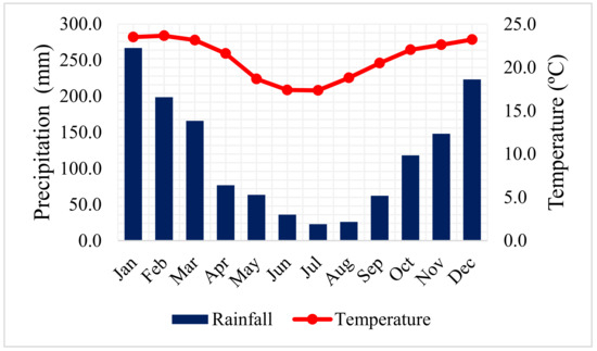 The Jacaré-Guaçu River Basin lies between the CWA and CWB climatic zones, with dry winters and humid summers [40]. Average annual precipitation is approximately 1400 mm, with a rainy season between October and March (Figure 2), which accounts for an average 80% of the total annual precipitation. Average monthly temperatures in the region range from 17.4 °C in June to 23.7 °C in February.