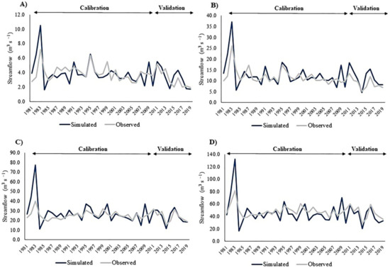 Comparison of simulated and observed data for annual streamflow for the calibration and validation period: (A) sub-basin SF-I, (B) sub-basin SF-II, (C) sub-basin SF-III, (D) and sub-basin SF-IV, with simulated values considering adjusted parameters β = 0.2, α = 1/12, and γ = 1.