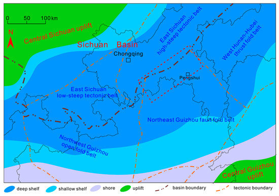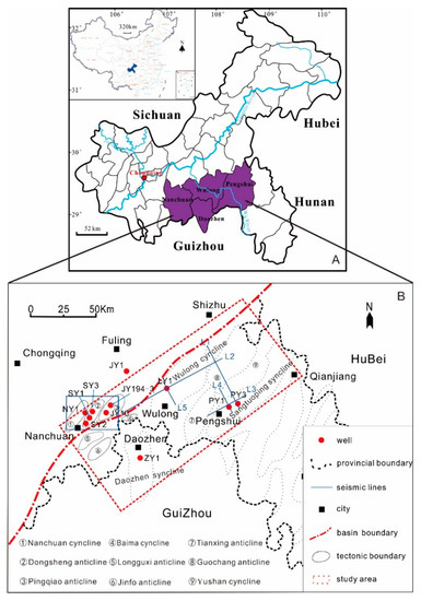The southeast Chongqing basin margin transition zone is located in the southeast margin of Chongqing, China and some areas in the north of Guizhou Province. It is a gradual transition area from the Sichuan basin to outside the basin from west to east (Figure 1). O3w-S1l in the area has experienced multi-stage tectonic movement and overpressure relief process, forming a series of gas reservoirs with distinctive normal pressure characteristics. In the basin, the formation pressure coefficient is mostly greater than 1.2, while it is generally less than 1.2 in southeast Chongqing [10,11].