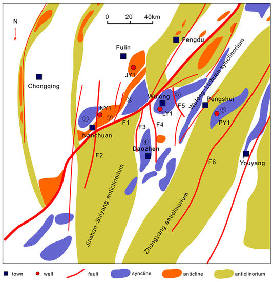 Southeast Chongqing has experienced the tectonic transformation of Caledonian movement, Hercynian movement, Indosinian movement, Yanshan movement and Himalayan movement [24]. Under the repeated lifting and stretching of Caledonian movement, the early structural pattern of alternating uplift and depression was formed, which is the main factor for the formation of fold deformation and multiple structural styles in the study area. The tectonic uplift of late Yanshan period caused the formation to be eroded and formed a widely distributed pattern of residual anticline and syncline alternately distributed. Among them, the axis of the residual anticline is narrow, the stratum is steep, and the stratum denudation degree is relatively high. Therefore, the residual anticline is generally small in scale and the internal structure of the stratum is relatively complex. The residual syncline has a wide extension, small stratum angle, simple structure and large area (Figure 7).