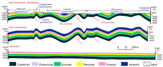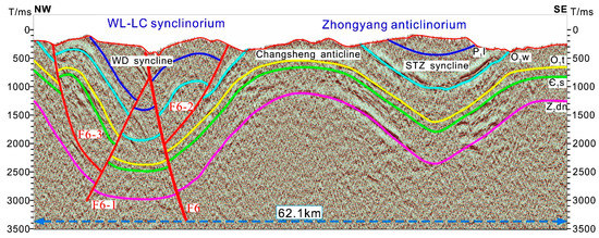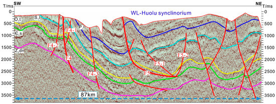 Wulong syncline an overall wide and gentle syncline structure which is located in WL-LC synclinorium. Its two wings are basically symmetrical and strike northeast. The syncline core is near the F5 fault, which can be seen from the NE section. It is cut into WL syncline and Huolu syncline by the F5 fault. From the NW seismic section, the characteristics of the two synclines are similar. The analysis shows that in the early Yanshan period, the strata were compressed in the SE-NW direction and formed a wide and gentle syncline in the NW direction. In the late Yanshan period, it was transformed by east–west compressive stress and divided into two independent synclines. As it is close to Qiyueshan fault zone, Wulong syncline fault is developed, and thrust forms a high, steep and narrow thrust structure, showing the characteristics of barrier fold. The exposed strata of WL syncline are Triassic, and the exposed strata of Huolu syncline are Permian (Figure 6).