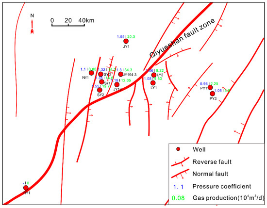 Qiyueshan fault is the largest fault system in the study area. The whole fault system is a large thrust fault distributed in NE direction. Geologically, it is usually used as the boundary between inside and outside the Sichuan Basin [25]. The west side of Qiyueshan fault is mainly Nanchuan block, in which the Wufeng and Longmaxi Formations gradually show the characteristics of normal pressure as it is closer to Qiyueshan great fault. The east side of the Qiyueshan fault, such as Wulong and Pengshui blocks, is characterized by normal pressure, indicating that the fault system has a certain impact on the pressure relief of Wufeng-Longmaxi Formation. Therefore, Qiyueshan fault is also a sign of the transition of shale gas from overpressure to normal pressure in southeast Chongqing. Pengshui–Qianjiang fault system and Youyang–Xiushan fault system are also developed in the east, accompanied by many secondary faults, which have played a considerable destructive role in the preservation of shale gas.
