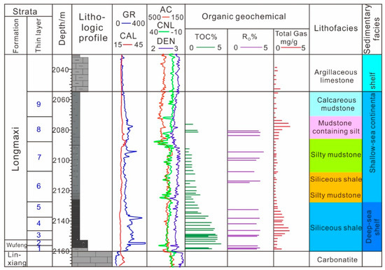 The study area is located in the favorable position of deep-water shelf sedimentary facies in the detention basin surrounded by central the Sichuan ancient land, Central Guizhou Uplift and Xuefeng uplift [19,20]. The study area is located in the favorable part of the sedimentary facies of the deep-water shelf in the detention basin surrounded by the central the Sichuan ancient land, the central Guizhou uplift and the Xuefeng uplift, creating a closed and stagnant anoxic hydrostatic reduction environment during the deposition period, forming fine-grained sediments with high organic matter such as black siliceous shale, carbonaceous shale and biological fossils in O3w and the first section of S1l (Long 1), which is a typical deep-water shelf facies deposit [21,22,23]. The thickness of dark shale is about 90–120 m, while high-quality shale (TOC > 2%) is mainly developed in ww and the lower part of the Long 1, with a thickness of about 30 m (Figure 2).
