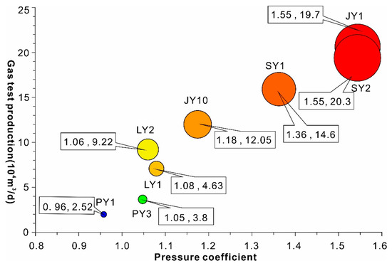 Formation pressure coefficient is not only an engineering factor considered in the development process, but also an intuitive response to the preservation conditions of shale gas [29]. Generally, there is a positive correlation between the actual gas production and the formation pressure coefficient (Figure 10).