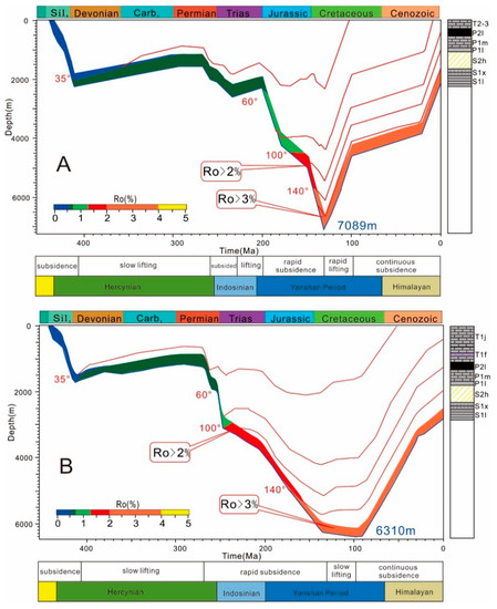 Early uplifting and stretching, but with a small uplift and accompanied by a decline, the Early Silurian Longmaxi Formation has good preservation conditions. In the long-term tectonic evolution process (from late Yanshan to late), the Longmatai Formation shale had a limited variation in the overall buried depth, with an average depth of 4500–6500 m, while the maturity of the Longma Creek shale was over mature, and the average vitrinite reflectance (Ro) was more than 2.5. Until the late Yanshan, the tectonic uplift resulted in the massive erosion of the Longma Xi formation. The burial depth of the remnant syncline can reach 1500–3500 m and has relatively better preservation conditions.