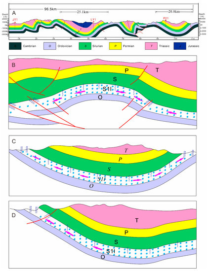 The preservation of natural gas is affected by structural factors such as the fold bending degree of shale formation, fault shape, denudation intensity and structural style. Generally, the shale formation with small tectonic action and wide and gentle formation is well preserved in the weather, such as the shale formation of Changning–Weiyuan Wufeng–Longmaxi Formation in the Sichuan Basin [30]. Due to the intense tectonic activity in southeast Chongqing, different tectonic styles are formed and superimposed by different stages of tectonic action, accompanied by serious stratigraphic denudation. Continuous multiple faults cause poor gas content, smaller formation pressure and increased development risk. The late Yanshanian tectonic movement formed the structural pattern of alternating distribution of residual anticline and residual syncline in the study area (Figure 13A). The residual anticline stratum was denuded seriously, the stratum angle was large, and the faults were densely distributed, resulting in poor preservation conditions of shale gas. The residual syncline strata are well preserved and the fault distribution is relatively sparse (Figure 13B). At the same time, the formation angle is small and has good preservation conditions. For example, the strata of Longmaxi Formation in WL syncline and STZ syncline are relatively wide and gentle, and the gas content is considerable (Figure 13C). Residual slopes also exist widely, which are characterized by steep slopes and gentle downward strata. Natural gas usually escapes from the denudation surface or fault at the top of the slope and has a good gas-bearing property (Figure 13D).