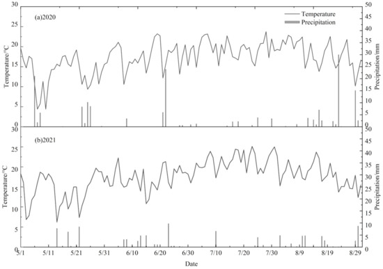 The experiment was conducted at Yimin Irrigation Experimental Station of Minle County, Gansu Province of China in 2020 and 2021. The research site is located at 38°39′ N, 100°43′ E, and 1970 m a.s.l. The region has a typical arid continental arid climate, with plenty of sunshine and a wide temperature variation. From 2000 to 2018, the annual mean air temperature and the average annual precipitation were 6.0 °C and 328 mm, respectively. The soil is characterized as a light loam of moderate fertility, and a pH value of 7.22. The soil field capacity is 24.0% (mass moisture content). The water table is about 20 m, and the irrigation area is not affected by salinization. The temperature and precipitation during the two crop growing seasons are shown in Figure 1. The total growing period precipitation was 176 mm in 2020, and 102.5 mm in 2021. The mean air temperature of the growing period was 17.27 °C in 2020, and 17.60 °C in 2021.