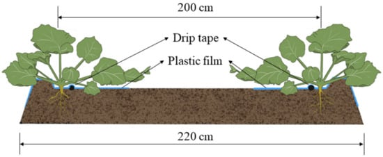 The pumpkin variety “Tianmi” was provided by Wuwei Dadi Industry Co., Ltd., Wuwei, China. Pumpkin seeds were sown on 1 May 2020 and 2 May 2021. In the first year, harvest was performed on 20 August 2020 and on 21 August 2021 in the second year. Seeds were sown between 200 cm row spacing and 50 cm on-row plant spacing and plants were watered by a drip irrigation system (Figure 2), in which the dropper spacing and the dropper flow were 30 cm and 2.0 L/h, respectively. The field trial was conducted in a completely randomized blocks design with 3 replications and 27 plots, each experimental plot covered 15.4 m2 (2.2 m × 7 m), and the total planting area was 415.8 m2. A row of pumpkins was coated with a white plastic film (70 cm wide, 0.08 mm thick), and two rows were planted in each plot. The planting density was 17,532 plants/ha. There were three gradients of soil water deficit: adequate water supply (F, 75–85% in field capacity), light water deficit (L, 65–75% in field capacity), and moderate water deficit (M, 55–65% in field capacity). There were four growth stages of pumpkin: seedling (46 days), vine extension (24 days), fruit expansion (25 days), and maturation stages (14 days). The effective pumpkin root depth was taken as 60 cm [34]. The experimental treatments were listed in Table 1.