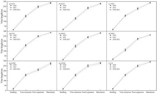 Figure 3 demonstrates the effect of irrigation on pumpkin vine length using diverse water deficit gradients at different stages. Pumpkin vine length increased at a variable rate as the crop grew and developed. Specifically: vine extension stage > fruit expansion stage > maturation stage > seedling stage. Compared to CK, the vine lengths of LFFF and MFFF with water deficit at the seedling stage were decreased by 11.32% and 20.27%, respectively. Water deficit at the vine extension stage, the vine lengths were decreased by 17.85% and 29.83% for FLFF and FMFF. For the fruit expansion stage with water deficit, the vine lengths were decreased by 8.54% and 15.63% for FFLF and FFMF, while the vine lengths of FFFL and FFFM were reduced to 1.55% and 4.21% at the maturation stage with water deficit. When compared to CK, all treatments had different levels of vine length reduction at the end of growth. For light water deficit treatments (LFFF, FLFF, FFLF, FFFL), vine length was reduced by 1.10% to 4.23%, while for moderate water deficit treatments (MFFF, FMFF, FFMF, FFFM), vine length was reduced by 2.89% to 9.61%. Water deficit at the vine elongation stage was not conducive to the accumulation of vine length.