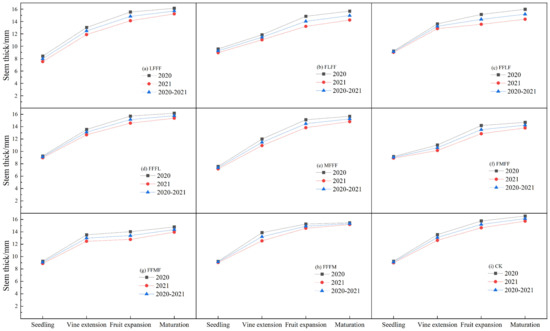 The effects of different developmental stages on the stem thickness of pumpkin irrigated with different water deficit gradients can be seen in Figure 4. Pumpkin stem thickness increased at a variable rate as the crop grew and developed. Specifically: seedling stage > vine extension stage > fruit expansion stage > maturation stage. Compared to CK, the stem thickness of LFFF and MFFF with water deficit at the seedling stage was decreased by 12.68% and 19.15%, respectively. Water deficit at the vine extension stage, the stem thicknesses was decreased by 12.50% and 19.04% for FLFF and FMFF. For the fruit expansion stage with water deficit, the water deficit was decreased by 6.84% and 11.91% for FFLF and FFMF, while the stem thickness of FFFL and FFFM reduced to 2.26% and 5.05% at the maturation stage. All treatments showed various levels of stem thickness reduction at the end of the reproductive period compared to CK, ranging from 2.26% to 7.34% for the light water regulation deficit treatment and 5.05% to 11.78% for the moderate water regulation deficit treatment. When compared to CK, the treatments FLFF, FMFF, and FFLF, FFMF reduced pumpkin stem thickness accumulation by 7.34%, 11.78%, and 6.01%, 11.00%, respectively, indicating that water regulation deficits at vine extension and fruit expansion stages both significantly inhibited pumpkin stem thickness accumulation.