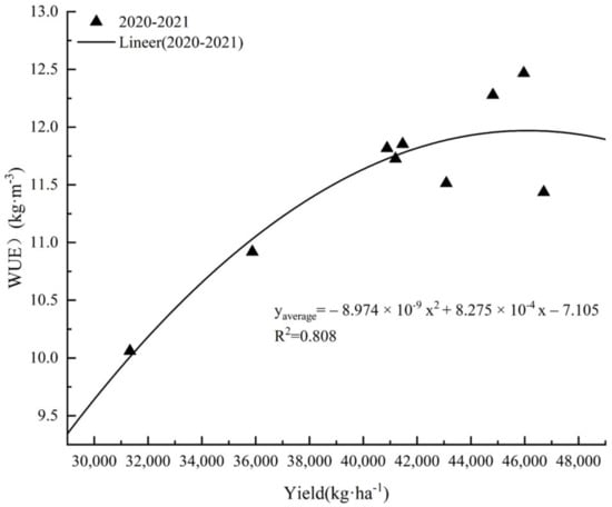 As shown in Figure 5, the relationship between pumpkin yield and WUE throughout the reproductive period in this study was a quadratic parabolic relationship, with a variation curve of: y = −8.974 × 10−9 x2 + 8.275 × 10−4 x − 7.105 (R2 = 0.808), where y is the water use efficiency (kg/m3), and x is the pumpkin yield (kg/ha). WUE increased as yield increased until it reached a critical point, at which point it decreased as yield increased, and that was not favorable to pumpkin in terms of enhancing WUE and achieving high yield while saving water.