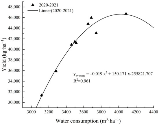 Figure 6 showed that the water consumption and yield of pumpkin in this study had a quadratic parabolic relationship during the overall growth period, with the variation curve being: y = −0.019 x2 + 150.171 x – 25,5821.707 (R2 = 0.961), where y is pumpkin yield (kg/ha), and x is water consumption (m3/ha). The yield tends to increase as water consumption increases, until reaching the critical point.