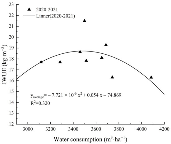 According to Figure 7, the quadratic parabolic relationship between water consumption and IWUE for pumpkin during the whole reproductive period in this study is: y = −7.721 × 10−6 X2 + 0.054 x – 74.869 (R2 = 0.320), where y is pumpkin irrigation water use efficiency (kg/m3), and x is water consumption (m3/ha). As shown in the figure, the IWUE increases as the water consumption of pumpkin increases, reaching a maximum of 21.49 kg/ha when water consumption rises to 3498.29 m3/ha. However, a continuous increase in water consumption leads to a decrease in IWUE.