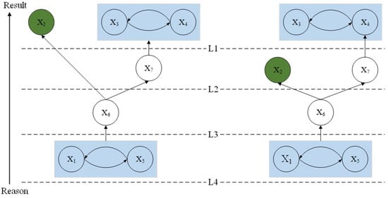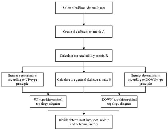 ISM is a model that processes information based on the relationship between determinants and the principle of incidence matrix. It regards determinant factors as “nodes” and presents the causal relationships between factors by using directed lines, applying a “result-oriented” way (or so-called “UP-type”) to divide the levels of each factor, so as to intuitively display the internal relationships between factors. It is popular in the analysis of structural problems of complex socio-economic systems because of its clarity [].
