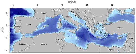 Some authors showed that the Strait of Sicily is a spawning area for Tuna species [,,,], whose hydrodynamic complexity, but limited spatial extent, can represent a useful natural laboratory to understand the impact of the oceanographic processes and conditions during the offspring dispersal phase on larval development and survival. Actually, the local surface circulation is dominated by the flow of the Modified Atlantic Waters (also known as Atlantic Ionian Stream (AIS) []).