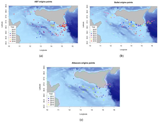 The backward trajectories of some longer-lived larvae, by species and by year are reported in Figures S1–S3. It is worth noting the case of ABT and Bullet in 2014, where the trajectories mimic the average AIS path (Figures S1e and S2e). Pattern distribution of ABT larvae origins evidences their concentration in the southern part of the study area, off the southernmost tip of Sicily (Capo Passero) (Figure 3a). This applies also to many of the larvae whose estimated hatching site is in the western sector (Figure S1). Similar patterns are evident for the other two Tuna species, even though for Bullet Tuna the final positions of backward trajectories appear to be distributed in shallower areas (Figure 3b,c). In general, the paths of larvae of the same age can differ considerably. Surface currents can advect them at relatively long distances, while in some cases they can be trapped by local mesoscale oceanographic structures.