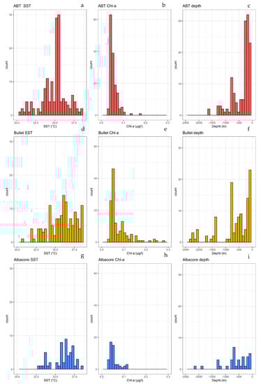 Histograms of environmental conditions, SST (a,d,g), Chl-a (b,e,h) and bottom depth (c,f,i), in the estimated hatching sites for the three Tuna species.