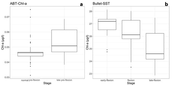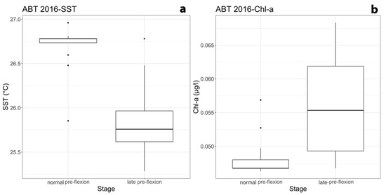Examining ABT data by year, only in 2016 were some significant differences detected when comparing “normal pre-flexion” and “latepre-flexion” larval stages vs. SST (p < 001; Figure 6a) and vs. Chl-a (p < 0.001; Figure 6b), with late pre-flexion associated with lower SST and higher Chl-a concentrations.